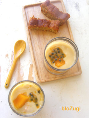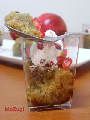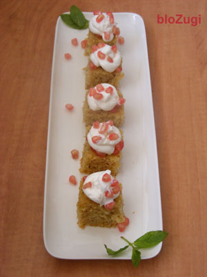 הרכבה: לפרוס את העוגה לריבועים (אפשר להגיש כפרוסות או להניח בתוך כוסות קינוח, במקרה כזה לקרוץ לעיגולים מעט יותר קטנים מקוטר כוסות הקינוח ולהניח פרוסות עוגה בתחתית כל כוס). לפזר גרגרי רימון למעלה.