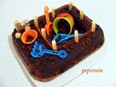 לגבי העוגה עצמה - חיפשתי עוגת שוקולד יציבה מספיק שתחזיק את כל היצירה ואוכל "לחפור" בה בלי בעיה. עוגה כושית הכנתי למסיבה עם חברים של גילעד שבוע קודם וכעת רציתי משהו אחר. ואז נזכרתי בעוגה שוקולדית מעולה, עוגת שוקולד וחלבה של פסקל פרץ רובין. את העוגה הזאת הייתי מכינה די הרבה, לפי המתכון מהספר המעולה "עוגת השבוע". מאז הרבה מים (ושוקולד) זרמו בנהר ושכחתי מהעוגה לגמרי, ועכשיו דפדפתי בספר החדש של פסקל "העוגות של פסקל" ושם ראיתי שוב את המתכון. אז הנה הוא כאן, עם קיצורי דרך שלי. וחפירה :)