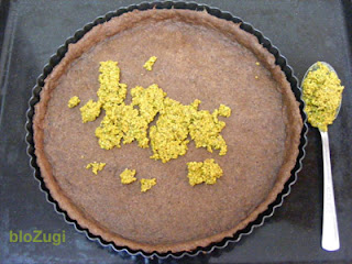 בתום 15 דקות אפיה להוציא את הבסיס לטארט מהתנור, בלי לכבות את התנור. לתת לו להתקרר כמה דקות ולהעביר את מלית הפיסטוקים מעל הבסיס.
