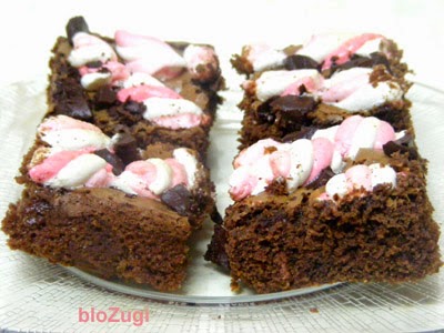 להוציא מהתנור כשהחלק העליון של הבראוניז עדיין קצת רך, לפזר מעל את השוקולד ואת המרשמלו ולהחזיר לתנור לכ-5 דקות נוספות, עד שהמרשמלו מתחיל קצת להשחים.