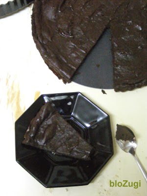 - העוגה תופחת בזמן האפייה ואחר כך חוזרת לגובהה המקורי. אפשר להקטין את קוטר התבנית ולקבל עוגה קצת ותר גבוהה, אני בכוונה רציתי עוגה נמוכה ודחוסה, שכיף לפרוס אותה למשולשים דקים ולאכול בביסים קטנים עמוסי שוקולד.