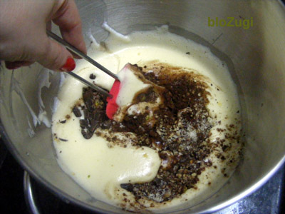 לקפל את החלבונים לתוך תערובת השוקולד. להוסיף חמאה מומסת ולערבב בעדינות לקבלת תערובת אחידה.